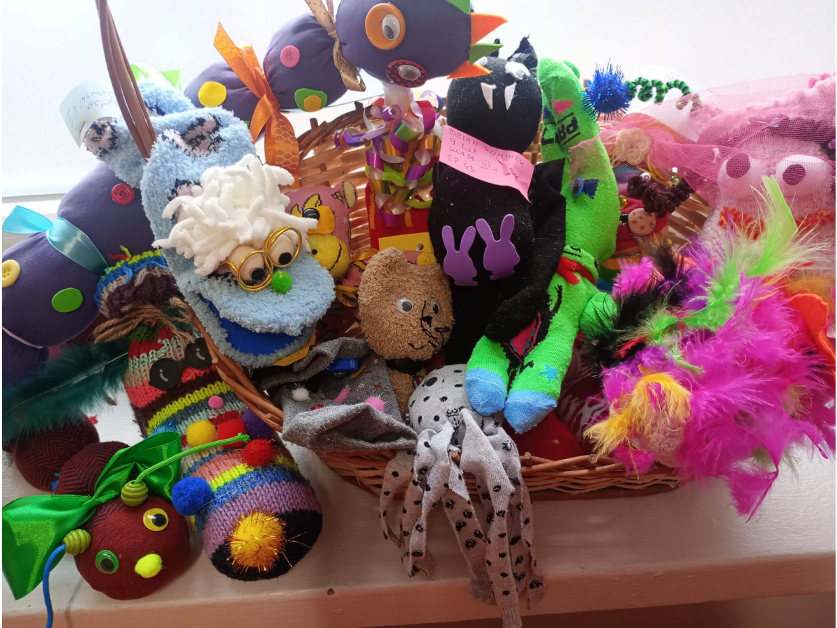 W związku z obchodami 21 marca Światowego Dnia Osób z Zespołem Downa społeczność szkolna włączyła się w akcję zakładając skarpetki nie do pary na znak jednoczenia się z osobami z Zespołem Downa i ich rodzinami. Chętni uczniowie klas 1-3 wykonali "Skarpeciaki" - maskotki na bazie kolorowych skarpetek. Wszystkie zachwycały pomysłowością.