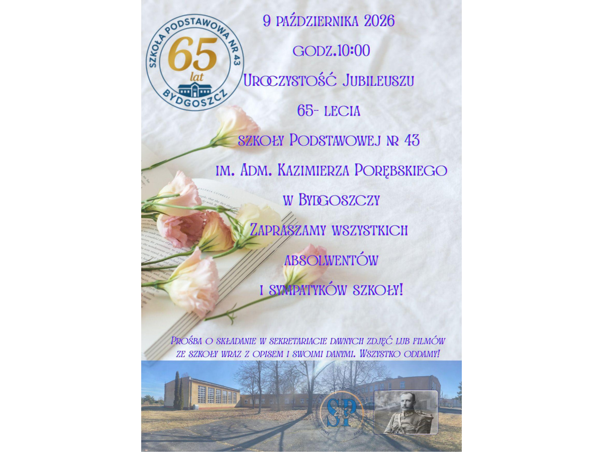 Zapraszamy 9 października 2026 r. o godz. 10.00 na Jubileusz 65-lecia Szkoły Podstawowej nr 43 w Bydgoszczy.