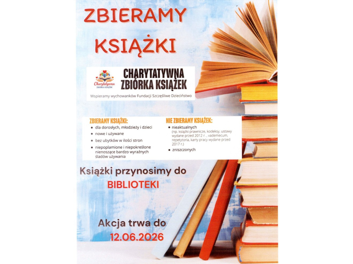 Charytatywna zbiórka książek trwa do 12 czerwca 2026 roku. Zachęcamy do włączenia się w tę inicjatywę i podzielenia się książkami, które mogą sprawić radość innym.