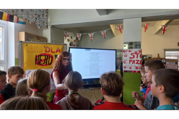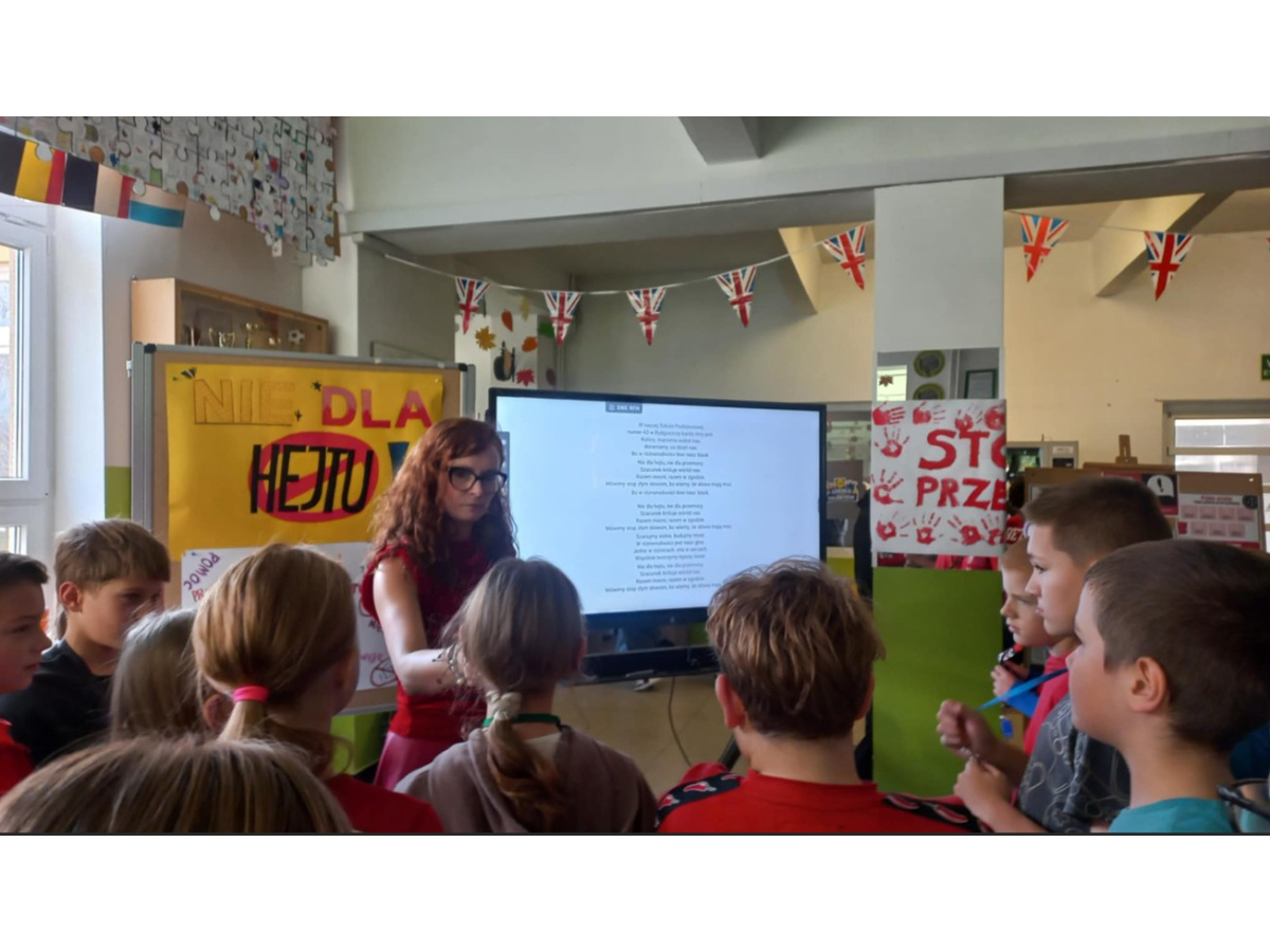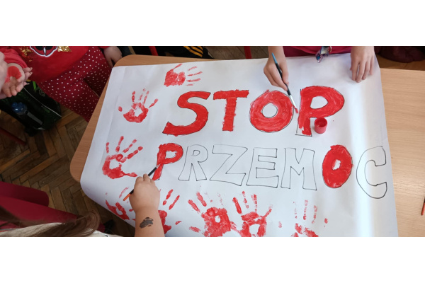 19 listopada obchodziliśmy Międzynarodowy Dzień Przeciwdziałania Przemocy, który był zwieńczeniem ogólnopolskiej kampanii Dzieciństwo bez Przemocy. Uczniowie klasy 3 mieli zajęcia na temat przemocy, podczas których powstał piękny plakat. Tego dnia odbył się również apel dla klas 4-8 podczas którego uczniowie mieli możliwość podzielić się swoją wiedzą na temat przemocy oraz zaśpiewać piosenkę "Nie dla hejtu", która powstała podczas tygodnia Przeciwdziałania Przemocy Rówieśniczej. Pod okiem wspaniałej Pani Asi uczyli się jej z ogromnym zaangażowaniem i zaśpiewali pięknie. Przenośmy wartości zawarte w słowach piosenki na nasze szkolne życie i świat poza murami szkoły.
