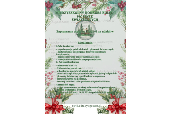 Ogłaszamy Międzyszkolny Konkurs Kolęd i Piosenek Świątecznych w SP43 Bydgoszcz