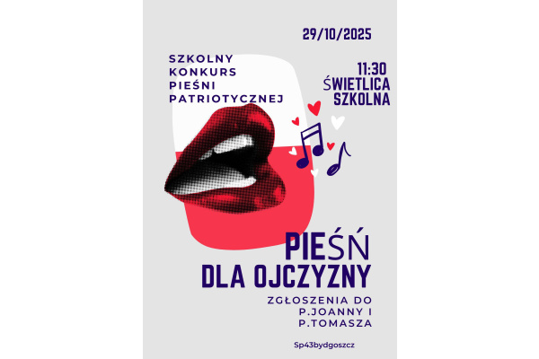 Zapraszamy do udziału w szkolnym konkursie pieśni patriotycznej "Pieśń dla Ojczyzny". Zapisy w świetlicy u Pani Joanny Oździńskiej i u Pana Tomasza Mąki.
