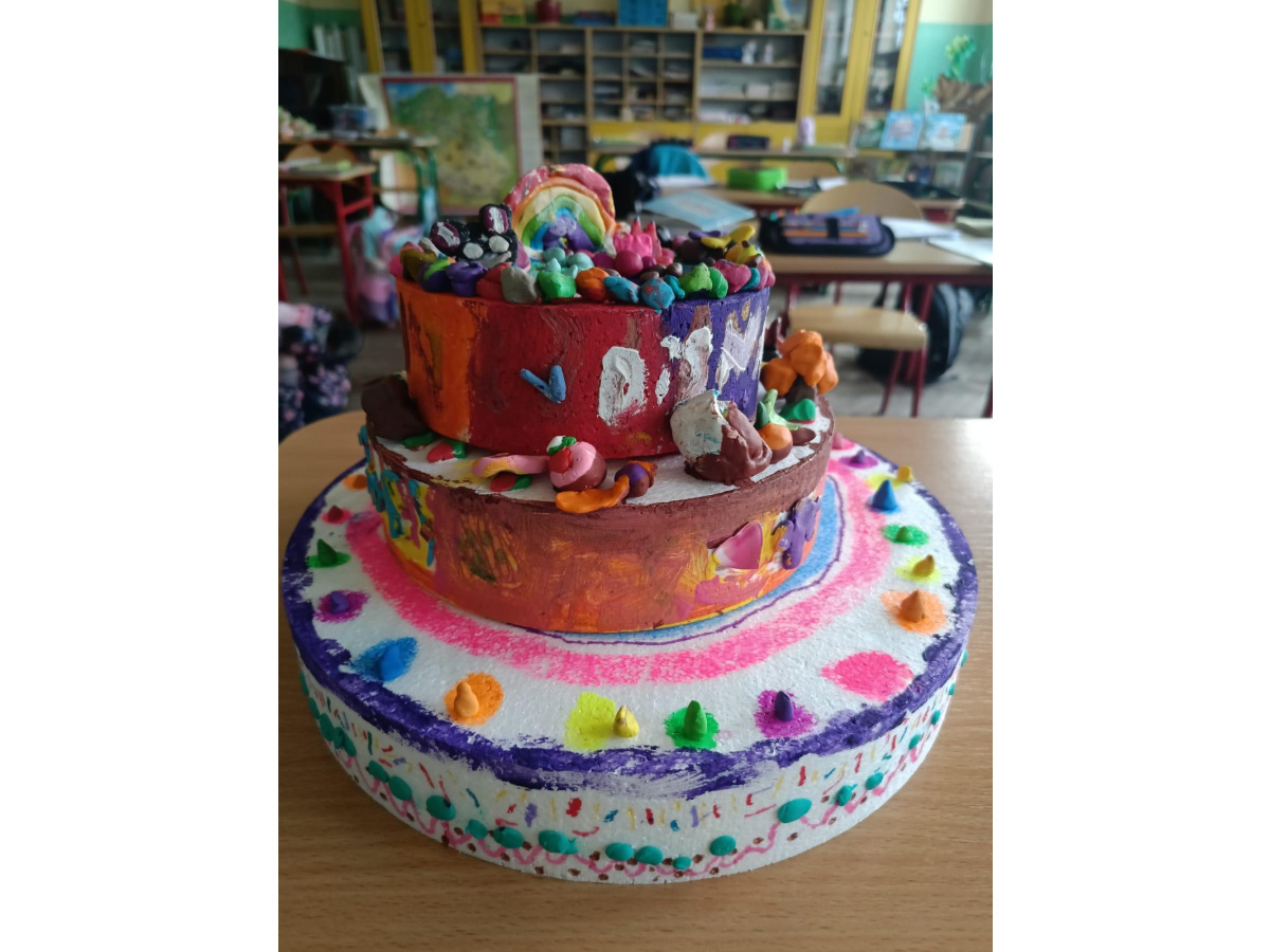 Uczniowie klasy I i II „zamienili się w cukierników” i udekorowali styropianowe torty przy pomocy plasteliny, mazaków, kolorowego papieru...