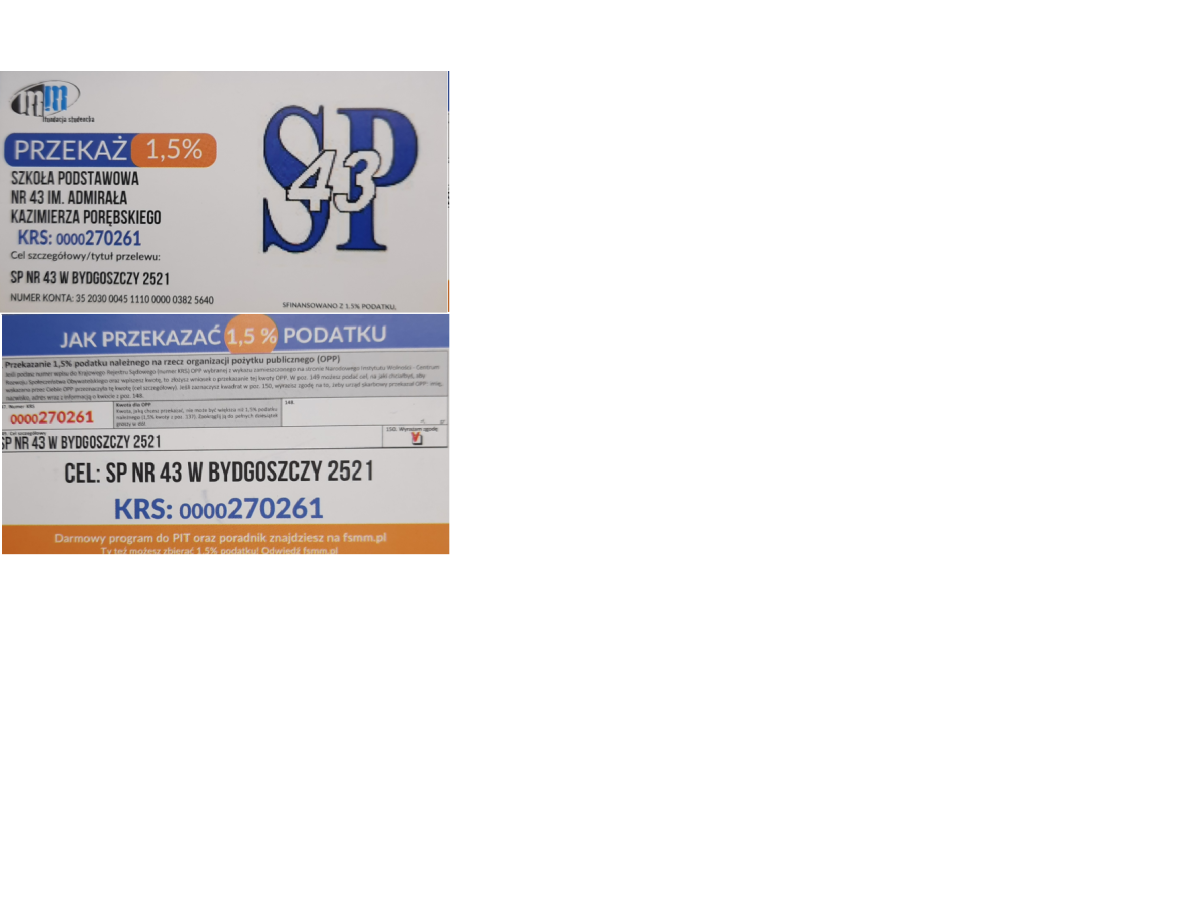 Zwracamy się z prośbą do rodziców i sympatyków szkoły o przekazanie 1,5% swojego podatku dla Szkoły Podstawowej nr 43 w Bydgoszczy. Będzie to realnie wsparcie dla szkoły – bez żadnych dodatkowych kosztów dla przekazującego!