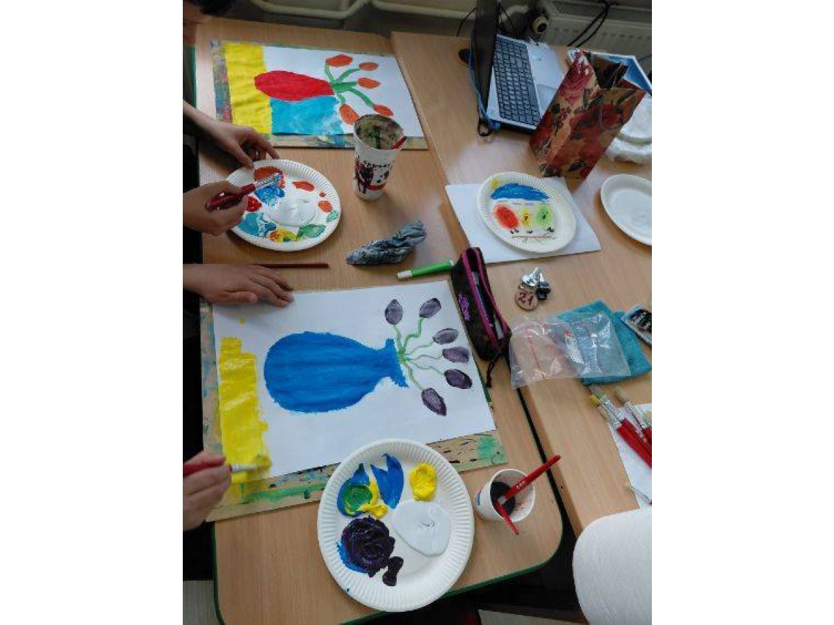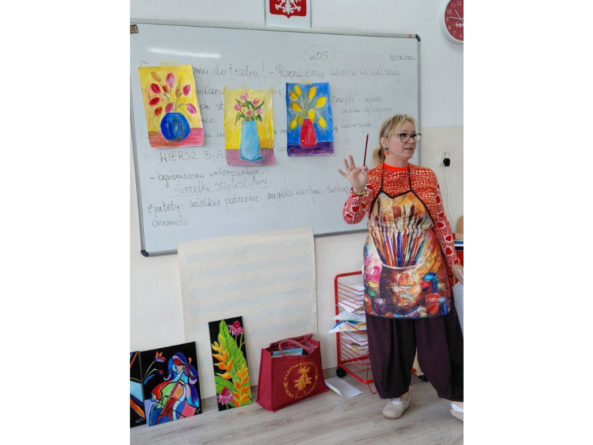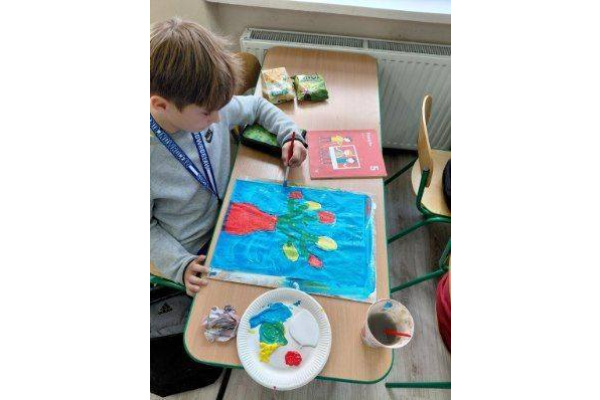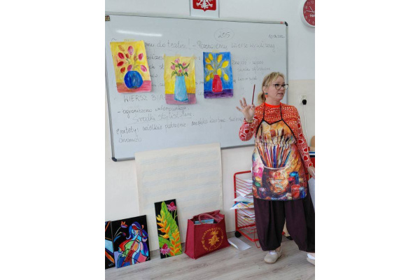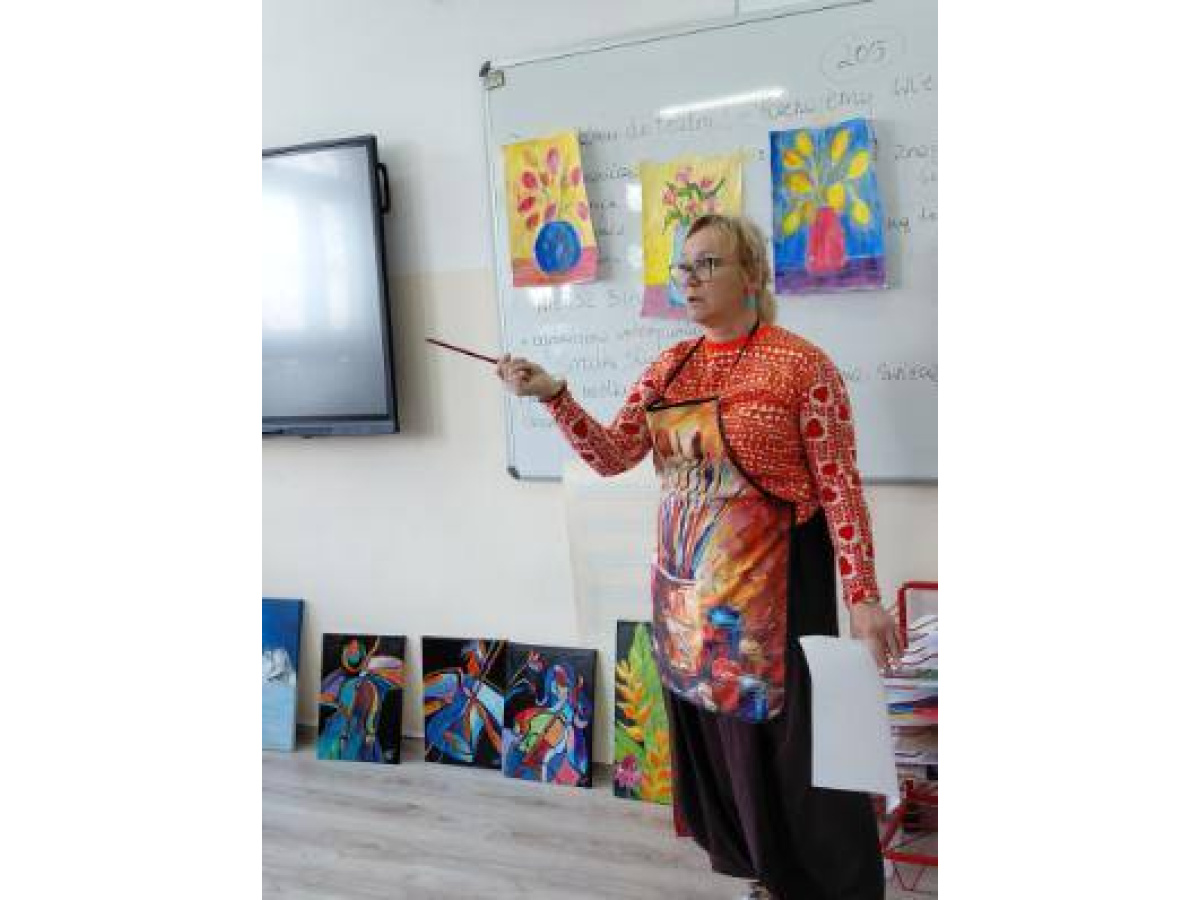 W naszej szkole gościliśmy Panią Joannę Kierlin - Serocką artystkę malarkę. Artystka przeprowadziła zajęcia malarskie dla naszych uczniów na temat " Martwa natura " Kwiaty w wazonie". Zajęcia miały na celu zapoznanie się z trzema kolorami podstawowymi. To klasyczne ćwiczenie malarskie, które pozwolą skupić się na kompozycji, kontraście i czystości barw. Uczniowie mieli możliwość pracować jak na prawdziwych warsztatach. Z użyciem farb akrylowych . Dziękujemy za przybycie i poprowadzenie zajęć .
