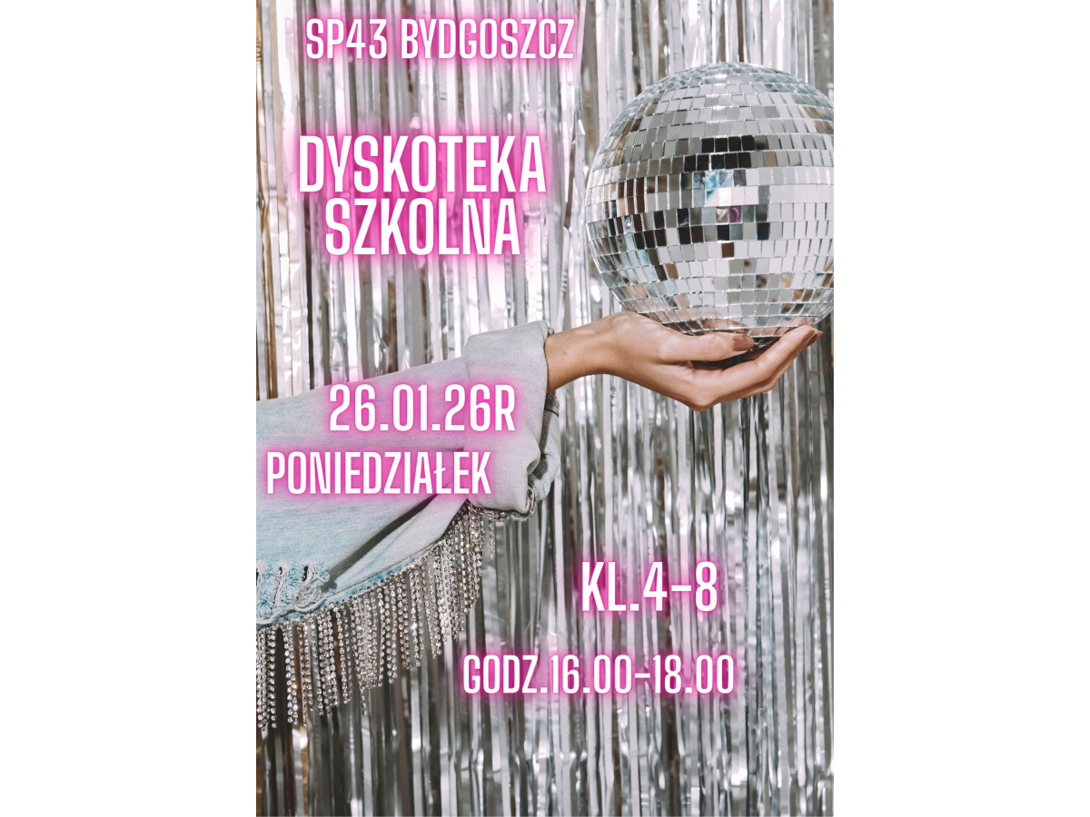 Zapraszamy uczniów klas 4-8 na Dyskotekę szkolną, w poniedziałek 26 stycznia 2026, od godz. 16.00 do 18.00