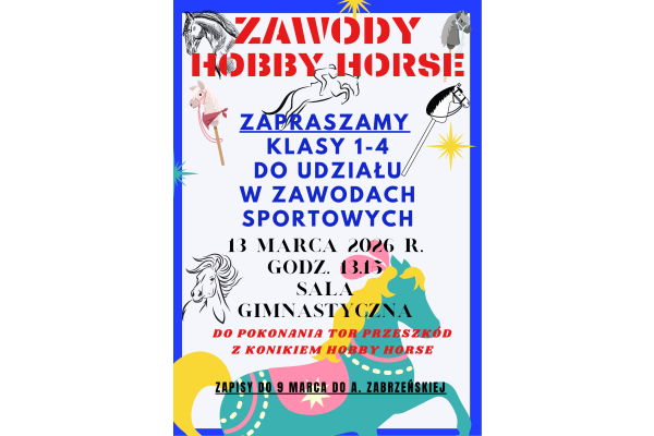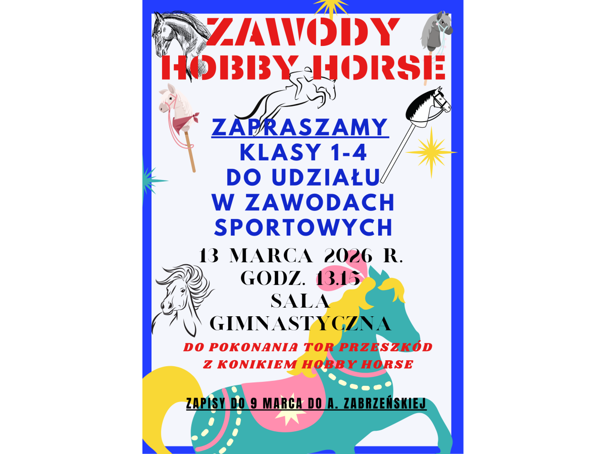 13 marca o godz. 13.15 zapraszamy uczniów klas 1-4 do udziału w zawodach sportowych HOBBY HORSE. Zapisy do 9 marca u p. Anny Zabrzeńskiej.